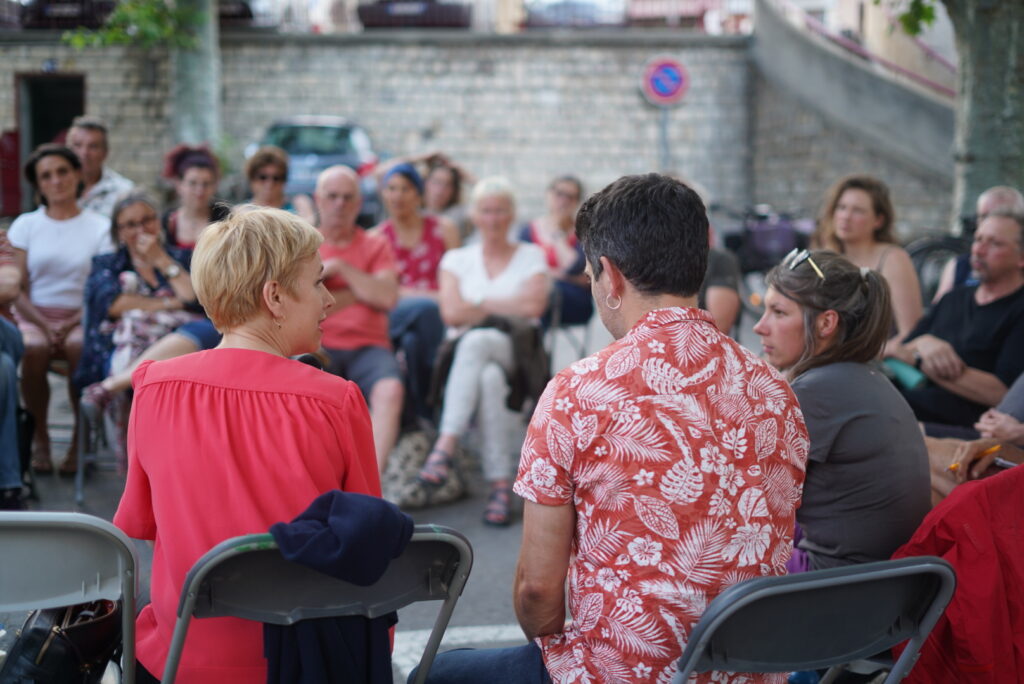 Après un excellent diner chez La Cocotte Epicée (ma page de publicité), Laurent Eyraud-Chaume a animé un débat « L’esprit public : réinventons la montagne », sur la place centrale de Veynes, devant la mairie qui sonne les heures (très républicain !). L’occasion de découvrir l’excellent travail de Fiona Mille, présidente de Mountain Wilderness France et auteure de “Réinventons la montagne. Alpes 2030 : un autre imaginaire est possible.”