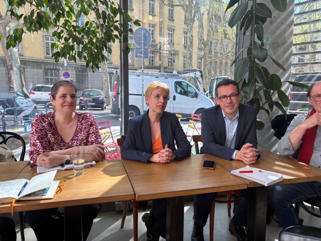 Après un chaleureux échange avec le maire écologiste de Lyon, Grégory Doucet, petite conférence de presse qui est l’occasion d’annoncer l’adhésion à L’Après de Laurent Bosetti, (excellent) maire-adjoint chargé de la promotion des services publics et du handicap. La vice-présidente de la métropole, Laurence Boffet, membre du mouvement Ensemble qui débat en ce moment de la création d’une force commune avec L’Après, est avec nous.